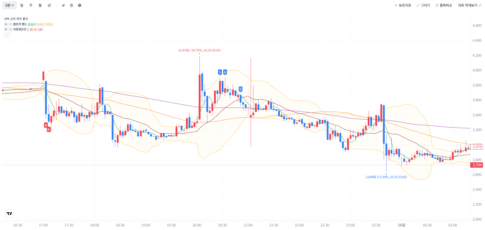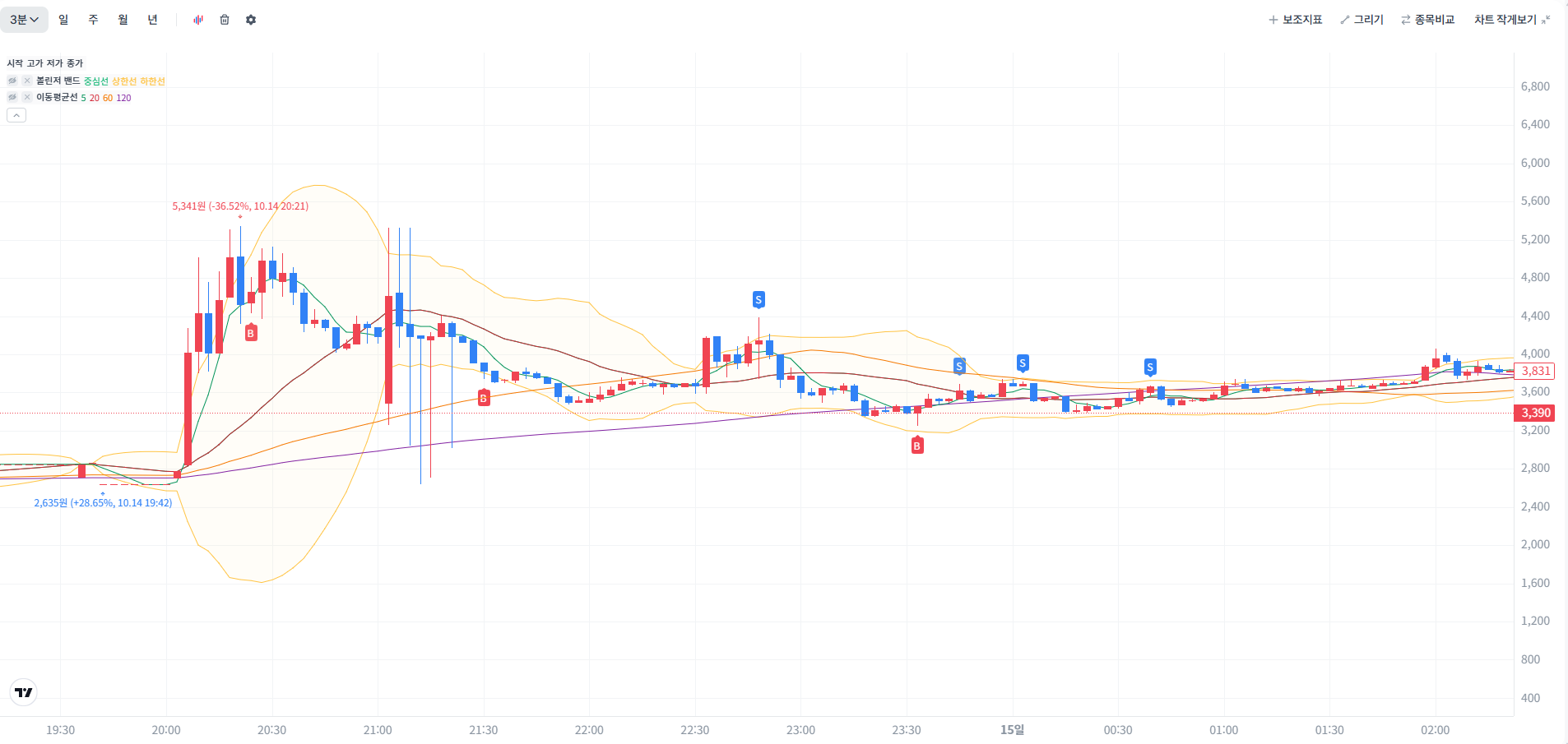 3시간30분의 횡보끝에 거래량이 붙으면 상승을 시작해 분할 매도를 하였다.