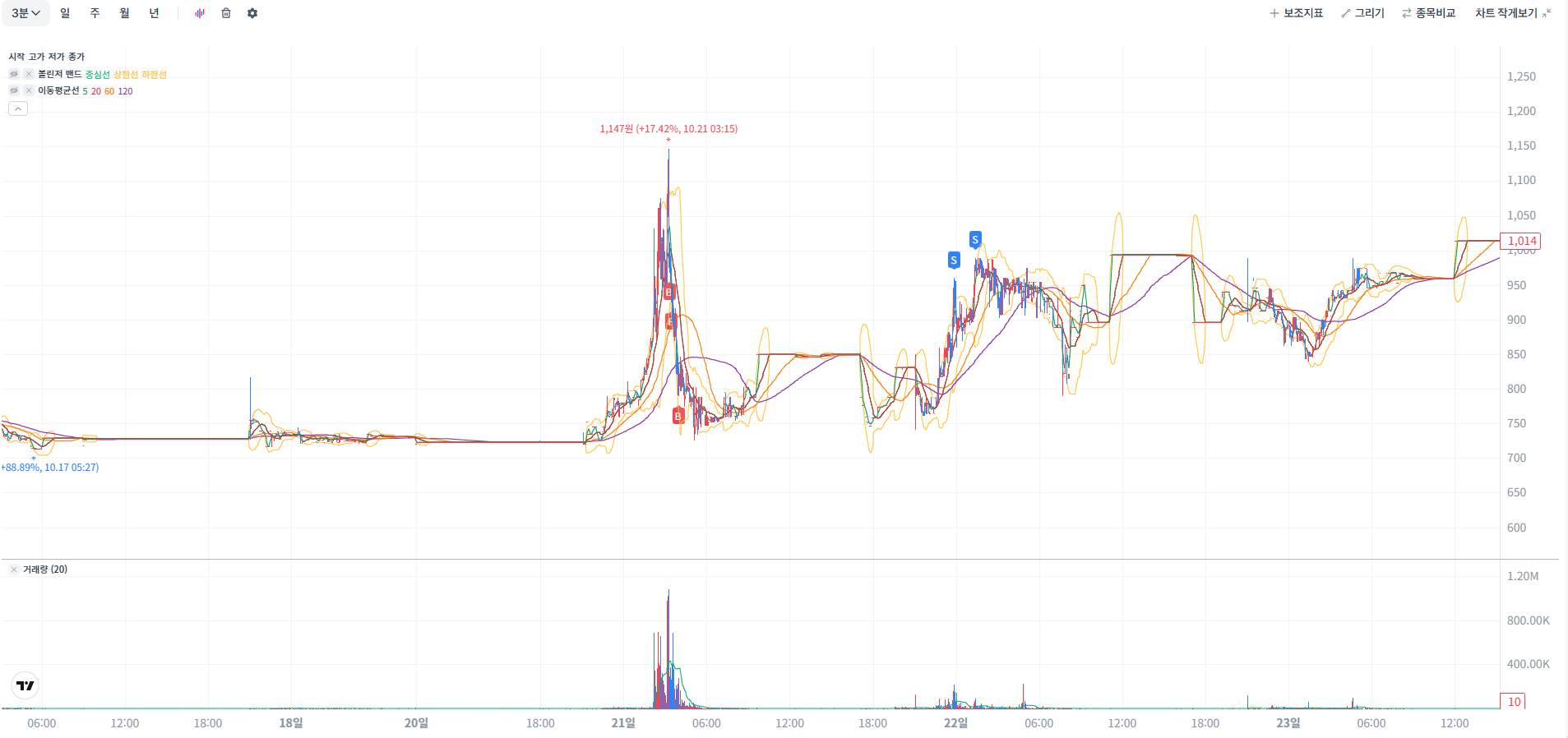 급등후 하락구간에서 반등노리고 진입했으나 시작점까지 하락해서 추매후 상승구간에서 분할매도 수익실현