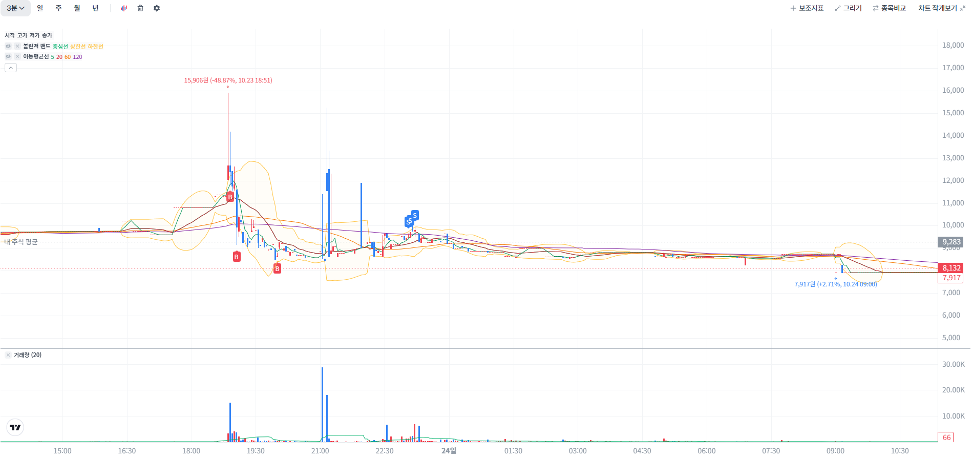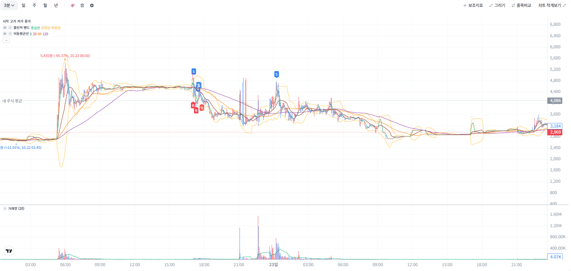 2차 급락시점에서 매수진입 이후 횡보하다가 장마감했으나 50:1 합병으로 거래일시 중시후 개장했으나 하락으로 손절하지못하고 일부 보유중